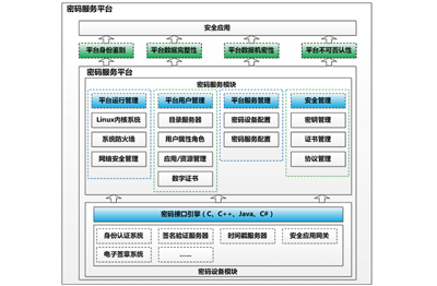 密码服务平台以商用密码为基础,结合国内安全需求与产业市场,借鉴成熟的平台技术框架与技术理念并自主创新,为安全应用的身份鉴别、数据完整性、数据机密性和不可否认性等提供密码支撑。